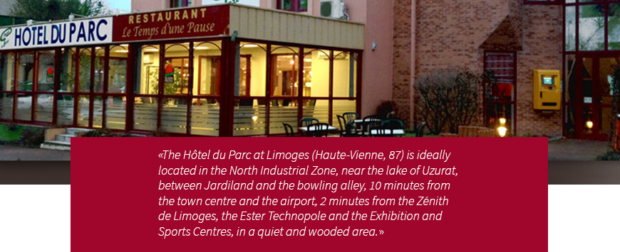 The Hôtel du Parc at Limoges in Haute-Vienne (87) is ideally located in the North Industrial Zone, near the lake of Uzurat, between Jardiland and the bowling alley, 10 minutes from the town centre and the airport, 2 minutes from the Zénith de Limoges, the Ester Technopole and the Exhibition and Sports Centres, in a quiet and wooded area.